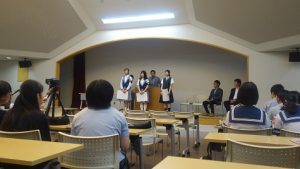 アナウンス部門の発表の様子です。自ら取材したものを400字のアナウンス原稿にして1分30秒以内で発表します。また当日山梨放送から課題原稿が出され、自校ニュースのあとに課題を読みます。