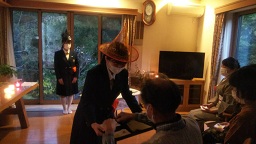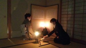和室の社中の方々からおもてないをしていただきました。ろうそくの灯りのもとでのお茶会は初めての経験で、幻想的な雰囲気を味わいながら過ごしました。