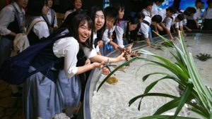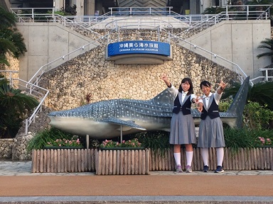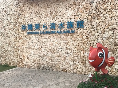 本日の見学場所、美ら海水族館の様子です。南国らしい建物や大型水槽で泳いでいる生物を見ることができます。