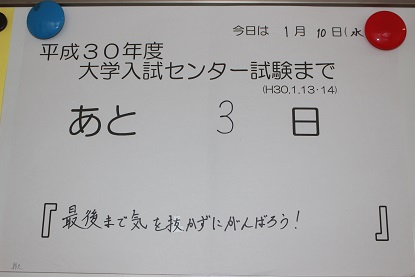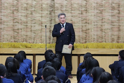平成30年1月9日(火)の放課後、大学入試センター試験事前指導と激励会が行われました。髙保校長先生、飯室進路主任、仲條学年主任より激励のお言葉をいただきました。