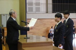 令和7年4月10日(木)本年度初めての納め式を行いました。ウエイトリフティング部・ボート部・科学の甲子園チーム・放送部の生徒が賞状などを学校に納めました。