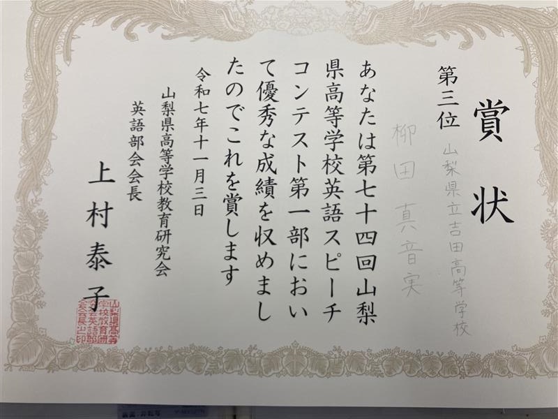 第74回山梨県高等学校英語スピーチコンテストの結果です。