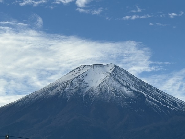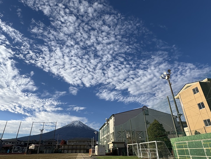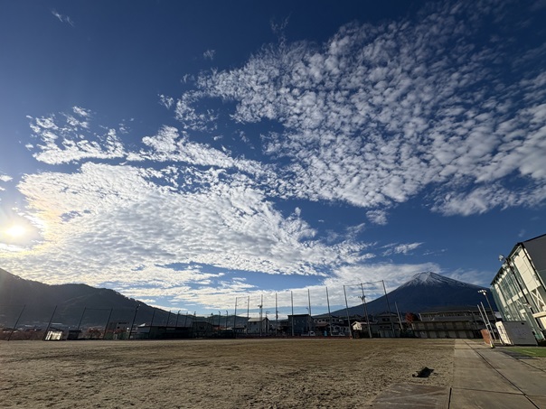 令和7年11月12日(水)今朝の富士山です。今朝の富士吉田市の気温は3℃です。寒い朝になりました。吉田高校のグラウンドから見える富士山ですが、時間の経過とともに雲に隠れてしまうことが多いので、朝一番に撮影してみました。