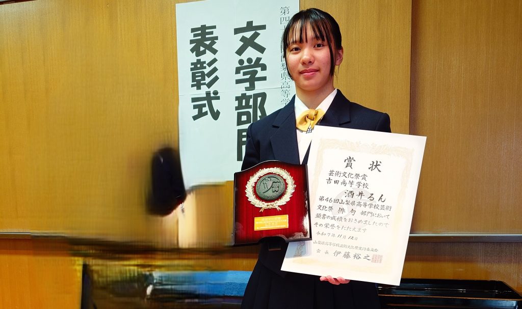 令和7年11月12日(水)甲府西高校において「文学部門の表彰式」があり、代表として酒井るんさんが表彰式に参加してきました。