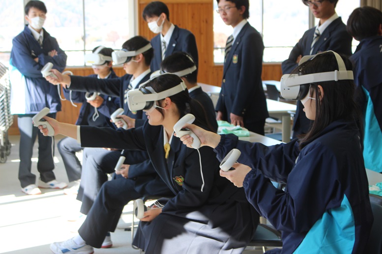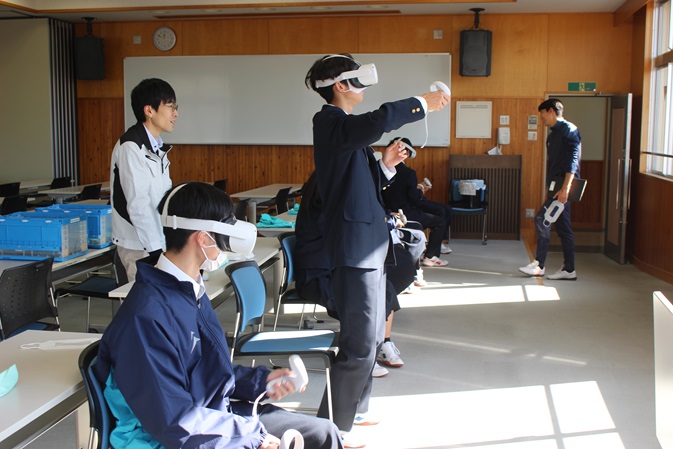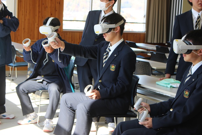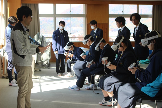 プログラミングの他に、今回はVRゴーグルを使った映像の世界を体験しました。山梨大学工学部の3年生が360度カメラを用いて映像を録画し、それをもとにプログラミングしたものを見せていただきました。生徒は興味津々でした。