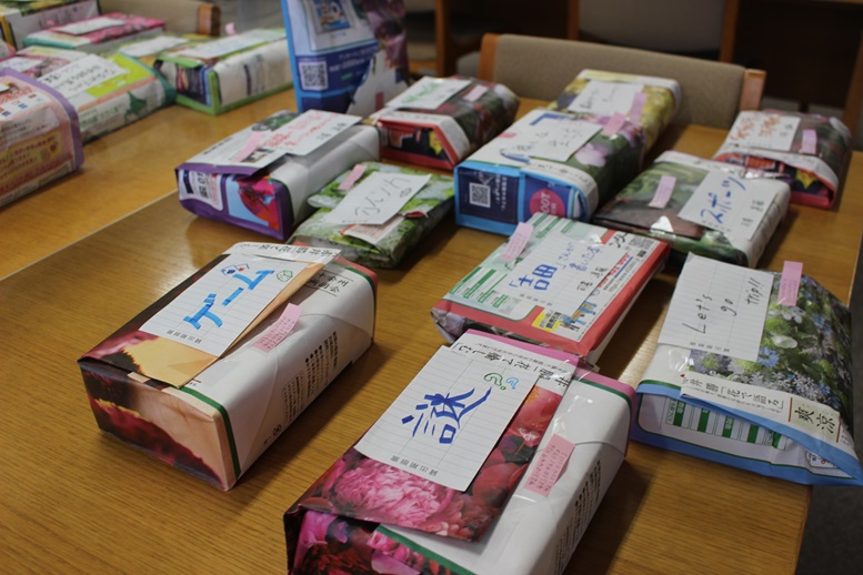 教職員や図書委員がセレクトした本や雑誌が3冊セットで袋に入っています。中身は借りてみてのお楽しみ。自分では手に取らない本と出会えるかもしれません。興味のあるテーマはありますか?