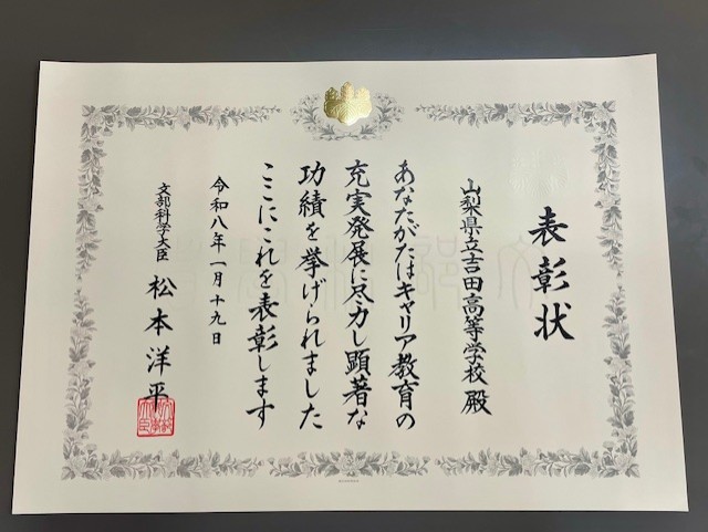 令和8年1月19日(月)に文部科学省講堂で開催されました「令和7年度キャリア教育推進連携シンポジウム」において、キャリア教育優良学校として文部科学大臣表彰を受賞しました。