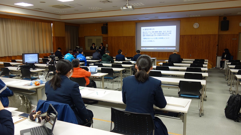 代表8班の皆さん、発表お疲れさまでした。この日のために探究活動、資料づくりなど大変だったと思います。興味深いテーマを掘り下げて時間をかけて活動しましたね。素敵な発表をありがとうございました。そして審査員の皆さま、長時間にわたり生徒の発表を聞いていただき、ありがとうございました。これからも吉田高校をよろしくお願いします。