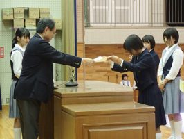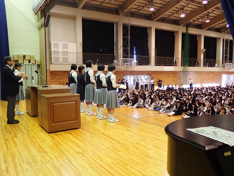 平成30年9月6日(木)に行われた第50回富士登山強歩大会表彰式が行われました。男女上位6位まで入賞した生徒に髙保校長先生より表彰状とトロフィーを手渡しました。