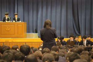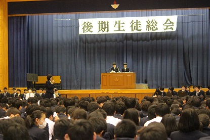 第70代生徒会本部役員も紹介されました。議事録を確認して後期生徒総会が終わりました。最後に小佐野教頭先生より講評をいただきました。