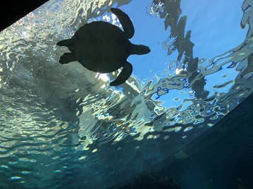 生物に触ったり、大きい水槽で泳いでいる魚たちに興味津々です。